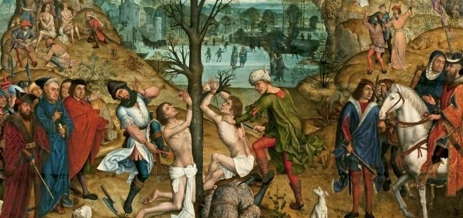 In some versions of the story, they are brothers, twins, but there’s no support for this, other than one time my brother thought Corey Haim and Corey Feldman were brothers, and this feels of a piece with that. Aert van den Bossche paints them as brothers in a broad canvas with martyrs as far as the eye can see, in amongst scenes of gorgeous velvet fashion and ice skating. They’re all Crispins, except when they’re dogs. Art historians draw a line from Pieter Bruegel the Elder to Hieronymys Bosch, but I see stronger echoes of van den Bossche in Bruegel. It’s the ice skating that tips me off.