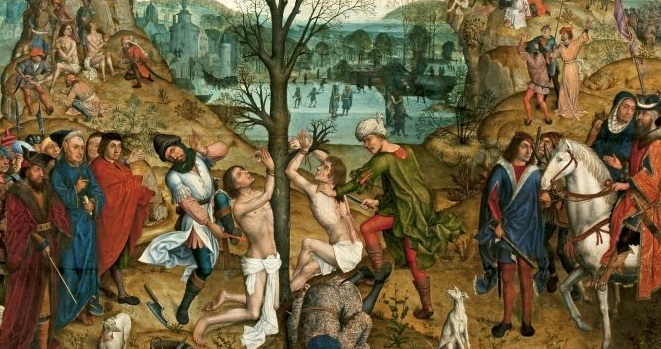 (Rictus Varus, who probably didn’t exist, and who ordered the execution that probably didn’t happen, in some stories is converted, too, to Christianity, and then martyred, though, of course, probably not. In some stories, he is persuaded by a woman, St Lucy of